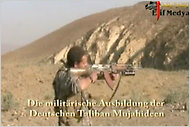 <A video still from a media affiliate of the Islamic Jihad Union and German Taliban Mujahedeen, is said to show a jihadist practicing his shooting skills.>